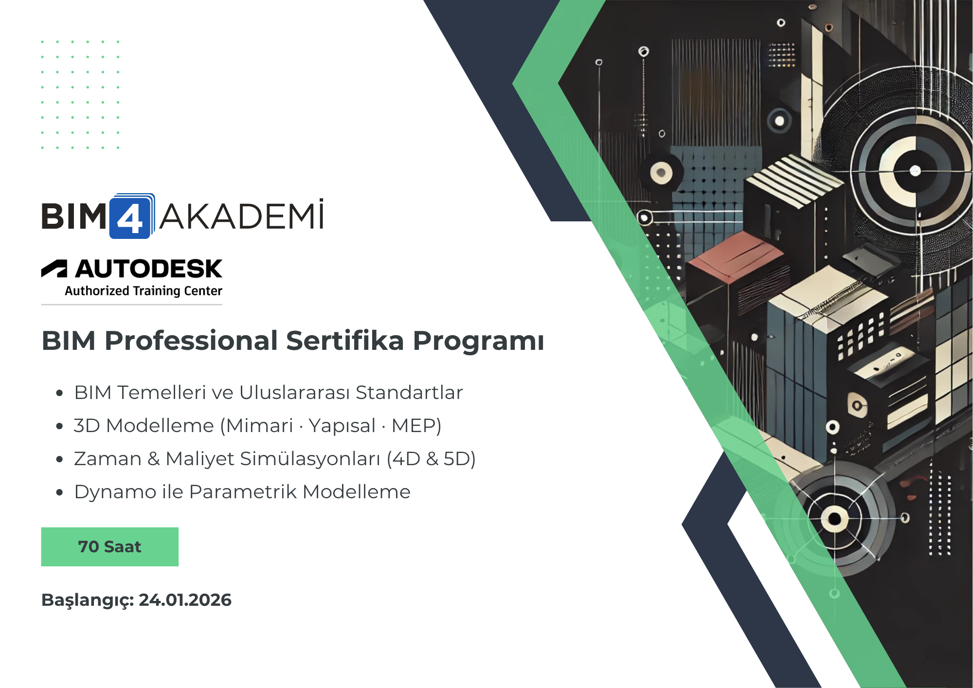 70 saatlik yoğun ve uygulama odaklı bu program sayesinde, yalnızca modelleme değil; analiz, koordinasyon, kalite kontrol, bulut tabanlı iş birliği ve otomasyon konularında da yetkinlik kazanırsınız. Eğitimin sonunda alacağınız uluslararası geçerli Autodesk Sertifikası ve BIM4AKADEMİ Sertifikası ile sektörün aranan BIM profesyonellerinden biri olmaya hazır olacaksınız.